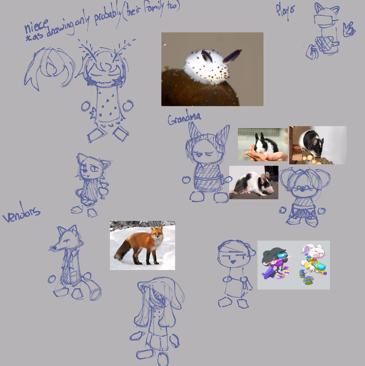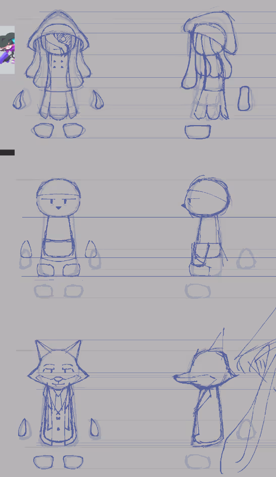 Various models I created reference sheets for in Clip Studio Paint and modelled in Blender. Animations I've created for them can be found here(2024)