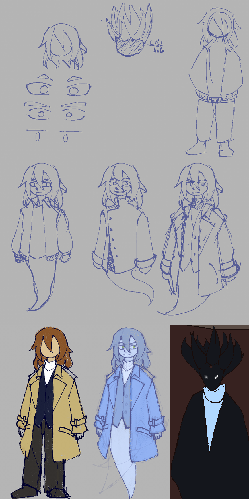 The continued iterations of Ace's and Eli's design to their finalized ones. Sketched by me in Clip Studio.